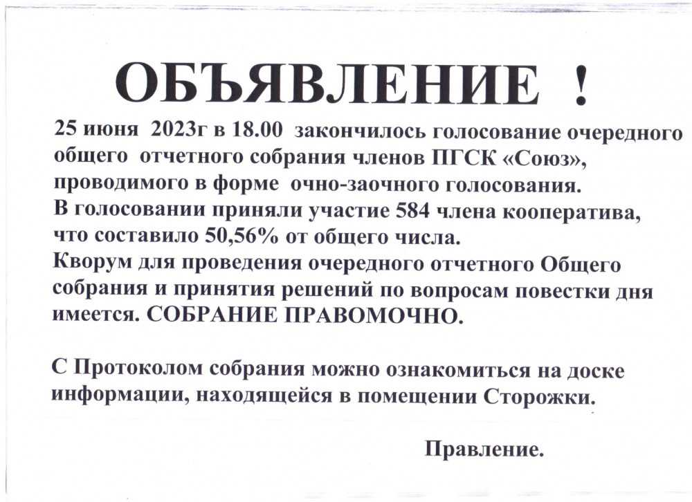 Очередного общего отчетно-выборного собрания членов потребительского гаражно-строительного кооператива "Союз", проводимого путем заочного голосования.